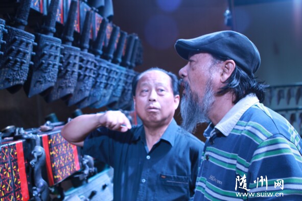 張士元先生通過對葉家山出土文物的現場查看,編鐘博物館館藏文物的鑒別,編鐘文化符號的追溯,通過對隨州曾侯乙編鐘文化的研究,對青銅器體系的器形、紋飾等多年懸而未決的文化之謎有了新的認識,加深了對黃河流域自夏商周,尤其是安陽司(后)母戊鼎等系列的原始祭祀青銅器文化理念的理解。他說,隨州出土的編鐘不僅是一種樂器,一種音樂藝術,更是一種民族源文化體現。應該將編鐘為中心的文物以宏觀視角和哲學思維融會貫通,把曾侯乙編鐘彩繪陪葬棺、木衣箱、射日衣箱、編鐘、镈鐘、彩漆五張器、彩漆笙、尊盤等青銅器文物的器形、圖案、符號等等結合起來考證破解。他希望隨州將編鐘文化與中華民族的上萬年黃河文化、長江文化結合起來,上升到一個新的高度。