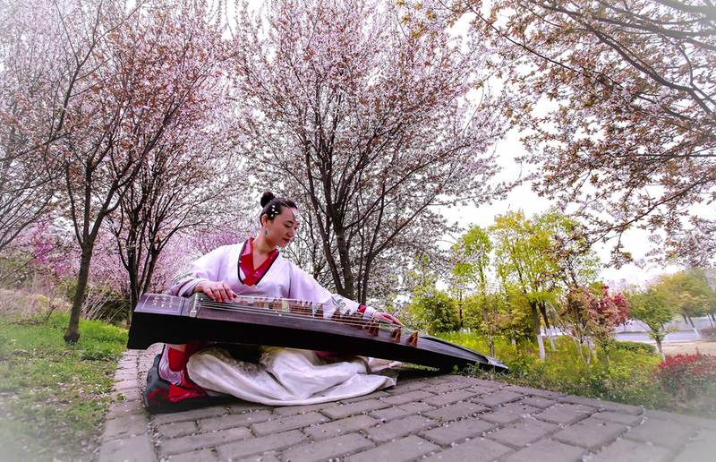 2月21日,隨州濱湖公園內紅梅綻放,一位女子身著漢服席地而坐、輕撫古箏,以悠揚琴音奏響春之樂章。
