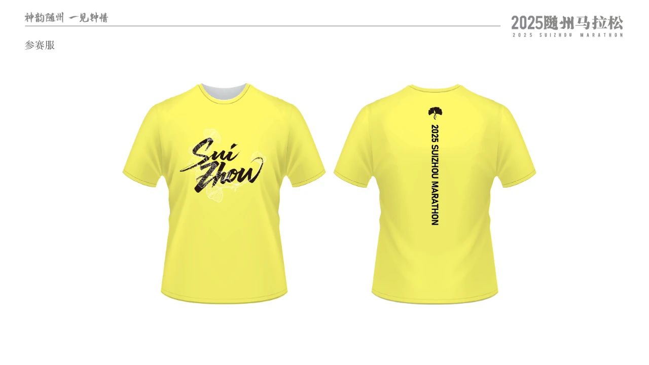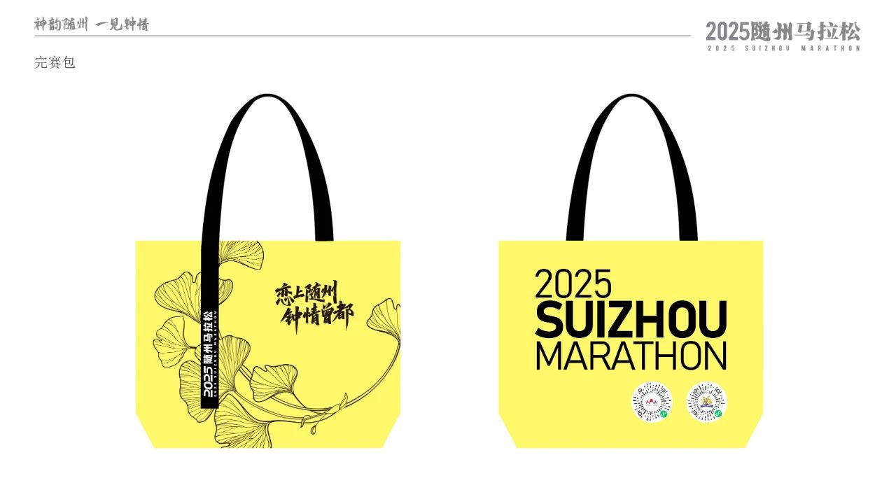 參賽物料設計深度融入隨州特色文化。參賽包采用紅黃主色調,正面以銀杏葉輪廓匯聚成“江山如畫”,背面突出“戀上隨州、鐘情曾都”。完賽獎牌以多片錯落銀杏葉構成主體輪廓,背面飾以編鐘紋路與象征音符的線條。