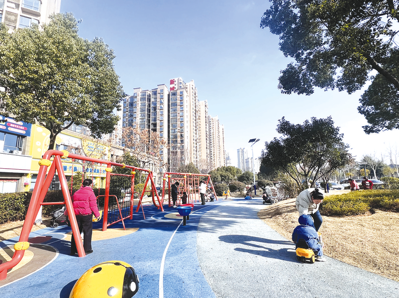 “家門口的口袋公園是我們帶娃遛彎的首選,方便又舒適。”1月9日上午,金泰國際小區門前的編鐘大道口袋公園內,市民周凡正帶著孩子曬太陽、蕩秋千,歡聲笑語在綠意間回蕩。