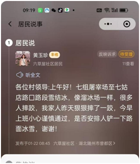 隨州新聞網(wǎng)訊(通訊員周冬生)1月20日,隨州市遭遇今冬大范圍強(qiáng)降雪,六草屋社區(qū)轄區(qū)主通道積雪雖已及時(shí)清除,但背街小巷因房屋遮擋、日照不足,積雪持續(xù)凍結(jié)成冰,給居民出行帶來極大安全隱患 。“巷子里結(jié)冰太滑了,老人孩子出門太危險(xiǎn),能不能想想辦法?”1月22日上午,社區(qū)善治美村服務(wù)平臺及小區(qū)微信群陸續(xù)收到居民緊急訴求。