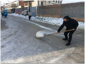 民有所呼,我有所應(yīng)。接到訴求后,社區(qū)迅速響應(yīng),第一時(shí)間組織黨員干部、網(wǎng)格員組成除冰突擊隊(duì),攜帶鐵鍬、融雪劑等工具奔赴結(jié)冰路段。隊(duì)員們分工協(xié)作,在背街小巷、拐角等易滑區(qū)域,采用“人工破冰+精準(zhǔn)撒鹽”的方式作業(yè)。他們揮動鐵鍬敲碎堅(jiān)冰,再均勻拋灑融雪劑,防止路面二次結(jié)冰。