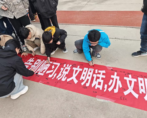 生代表發出倡議,號召從問好、守序、護綠等小事做起,讓文明內化于心、外化于行。在主題橫幅前,同學們有序簽名,落筆即是踐行文明的莊重承諾。學校本月將開展主題班會、文明標兵評選等活動,推動文明禮儀融入日常,共建和諧校園。