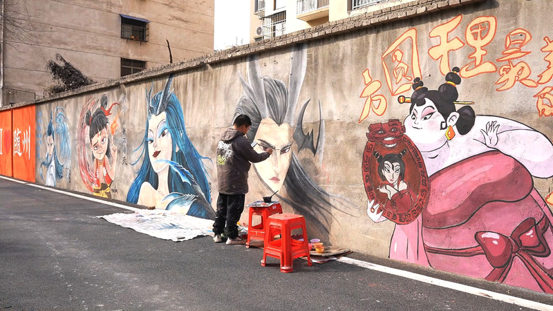 他以筆為犁,以墻為紙,將時下流行的動漫元素與質樸的鄉村自然風貌巧妙融合。其中,在曾都區南郊街道擂鼓墩社區的一條小巷里,一幅長達43米的《哪吒》主題巨幅墻繪,更是讓沉寂的墻面瞬間“活”了起來,迅速成為遠近聞名的網紅打卡地。經市融媒體中心《社會全方位》欄目等媒體報道后,相關內容全網傳播量突破2000萬,不僅極大地提升了社區的知名度,更點燃了當地的文旅熱度。短短半年時間,程豪威帶領著平均年齡相仿的團隊,完成了60余幅主題墻繪,用青春的畫筆點“靚”了鄉村顏值。