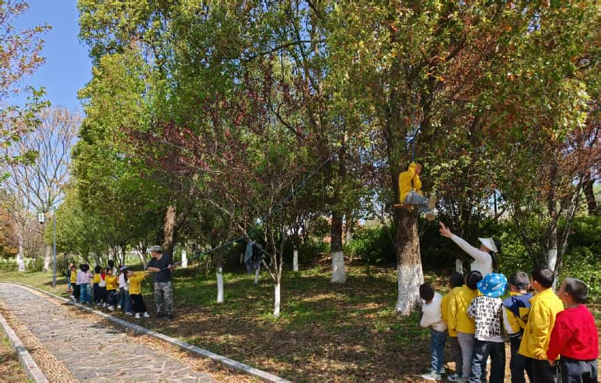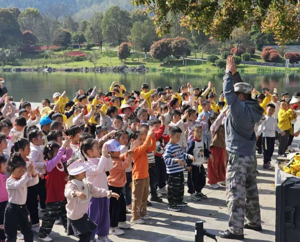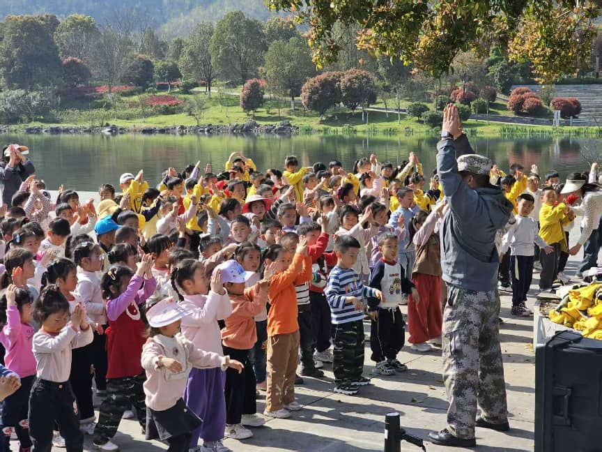 此次活動全程徒步2公里,一路上孩子們小手相牽、步伐堅定,無一人喊苦喊累,稚嫩的身影勇敢又堅持,在春日道路上形成一道活潑有序的靚麗風景線。抵達人工湖場地后,教官先帶領孩子們開展熱身活動,通過趣味肢體伸展、規范隊列練習,幫助大家活動筋骨、調整狀態,為后續游戲做好準備。