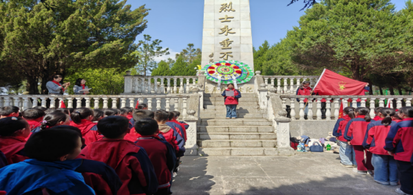 活動在莊嚴的出旗曲中正式拉開序幕,全體師生整齊列隊,面向烈士紀念碑肅立,齊唱國歌,默哀致敬,以最莊重的禮儀,表達對革命先烈的深切緬懷和無限哀思。 大隊輔導員丁老師為同學們深情講述革命先烈的英勇事跡,一段段可歌可泣的英雄故事,讓在場隊員們深受觸動,不少同學眼眶濕潤。蘇梓萱同學代表全體隊員發言,她表示,聆聽先烈事跡后備受感動,倡議全體同學以先烈為榜樣,勤奮學習、砥礪品格,繼承革命先輩的光榮意志,努力成長為對國家、對社會有用的新時代少年。最后,同學們依次獻上親手準備的鮮花,朵朵鮮花寄托著同學們對英烈的崇高敬意。