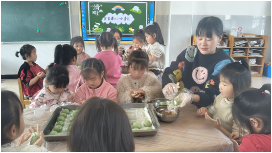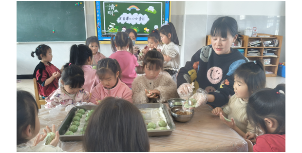 小班孩子手提竹籃“尋春插柳”,指尖觸摸嫩綠柳枝——柳枝發芽,是生命生生不息的模樣,老師輕聲告訴孩子:每一個生命都值得珍惜,逝去的要銘記,眼前的更要珍愛。中班揉捏青團,碧綠的糯米團包裹甜香,孩子們在制作中懂得:記憶可以用味道傳承,而此刻與伙伴、老師一起度過的時光,同樣珍貴。大班放飛紙鳶,畫筆描繪春日愿景,風箏高飛時,老師引導他們:思念可以飛向遠方,但更要珍惜當下每一次奔跑與仰望。