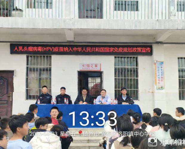 隨州新聞網訊 (通訊員吳娟、李金柱、孫方)為深入開展學校重點場所傳染病防控宣傳教育,正確引導適齡學生對HPV疫苗接種的認識,積極構建青少年傳染病防控防護網,提高疫苗接種率,4月3日下午,洛陽鎮衛生院組織健康管理宣傳小組一行到鎮中心學校,圍繞春季傳染病防控、HPV疫苗接種政策宣傳等主要內容開展了相關知識宣傳,轄區公安派出所工作人員、學校全體老師,部分學生及家長共計400余人一同參加。