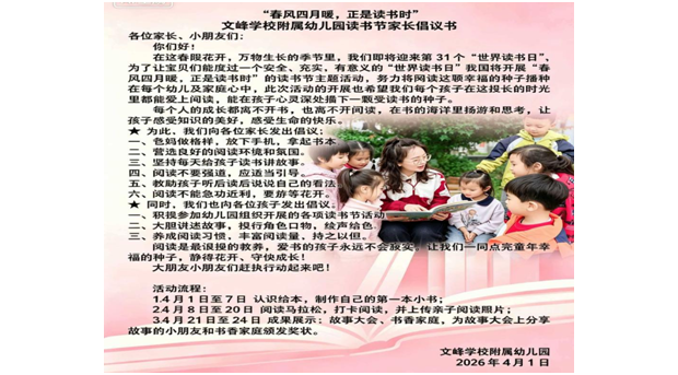 此次“書香滿園,快樂閱讀”世界讀書日系列活動,不僅讓孩子們在豐富多彩的活動中感受到了閱讀的魅力,養成了良好的閱讀習慣,更在幼兒園和家庭中共同營造了“愛讀書、讀好書、善讀書”的濃厚氛圍。今后,文峰學校附屬幼兒園將繼續以閱讀為媒介,深化家園共育機制,拓展閱讀活動的形式與內涵,讓書香浸潤每一個童年,為孩子們的終身學習和全面發展奠定堅實基礎,持續助力區域教育高質量發展,為優化營商環境注入更多人文溫度與文化力量。