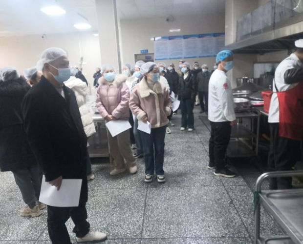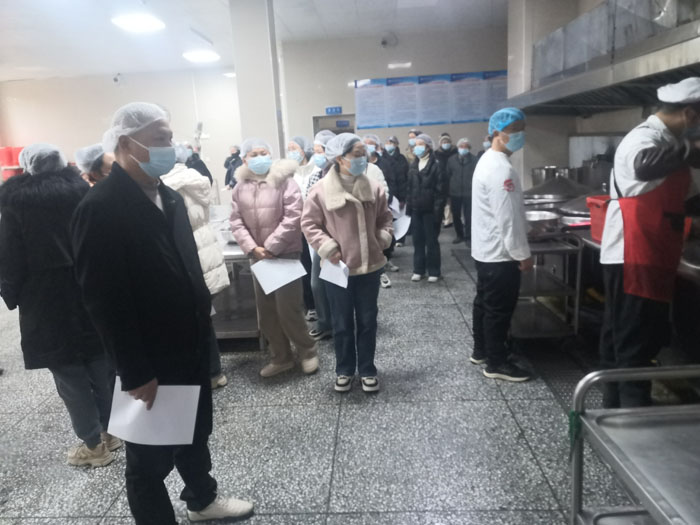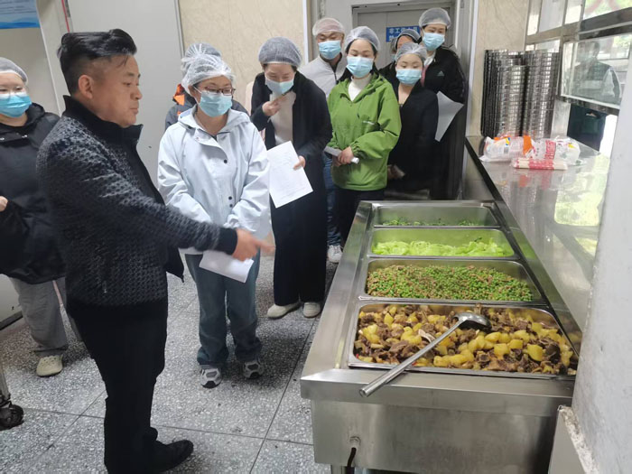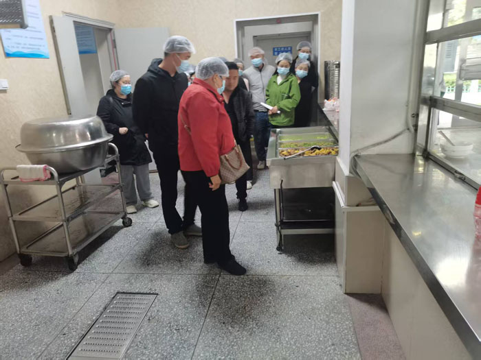 隨后,在工作人員的引導下,家長代表們嚴格按照規范流程,佩戴好一次性口罩、頭套,有序進入食堂后廚核心區域,開啟了“沉浸式”參觀體驗。從食材儲存區、清洗加工間、烹飪操作區,到餐具消毒間、食品留樣柜,家長們沿著“食材驗收—倉儲管理—清洗切配—烹飪加工—餐品留樣—餐具消毒”的完整動線逐一查看,不放過任何一個細節。儲存區里,糧油分類整齊、離地離墻存放,標簽清晰標注著生產日期與保質期;清洗切配區,工作人員嚴格執行生熟分開、色標管理,刀具與砧板分類使用,操作規范有序;烹飪區,廚師們身著統一工裝,在潔凈的灶臺前有條不紊地忙碌,精準把控火候與調味;消毒區,高溫消毒柜持續運轉,消毒后的餐具整齊存入密閉保潔柜;留樣柜中,每一份餐食都按標準留存125克以上,標注清晰的日期與餐次,嚴格執行48小時冷藏留存制度,全方位守護學生飲食安全。