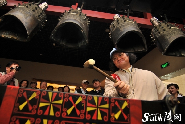 4月26日,由中華日報社、臺灣廣播公司等臺灣媒體新聞工作者組成的臺北市新聞記者公會豫鄂訪問團來我市訪問。訪問團一行在中華全國新聞工作者協會臺港澳辦公室、省新聞工作者協會有關同志的陪同下,參訪市博物館,零距離感受隨州悠久的歷史和編鐘文化(圖1)。這些人在臺灣、根在大陸的臺灣記者感嘆不已:隨州美,隨州文化博大!隨州日報社和臺辦負責人陪同訪問團參觀。 敲響千年編鐘,感受中華文化,臺北市新聞記者公會理事長袁天明敲響編鐘,體驗編鐘美妙動聽的旋律(圖2)。