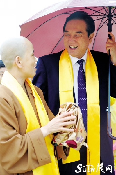 ▲海峽兩岸關(guān)系協(xié)會(huì)會(huì)長(zhǎng)陳云林(右)與省佛教協(xié)會(huì)副會(huì)長(zhǎng)洪山禪寺住持徹慧交談。