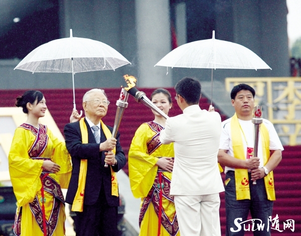 ◆臺(tái)灣新同盟會(huì)會(huì)長(zhǎng)許歷農(nóng)(左二)、“信義兄弟”孫東林(右一)、奧運(yùn)冠軍李小雙(右二)點(diǎn)燃圣火。