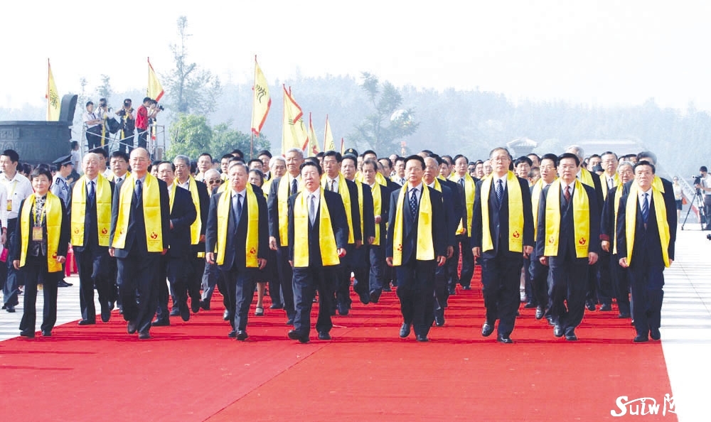 ▲參加尋根節的領導和嘉賓步入大典現場。前排為:全國人大常委會副委員長陳昌智(前排右四)、全國政協副主席孫家正(前排左四)、湖北省委書記、省人大常委會主任李鴻忠(前排右三)、全國人大環境與資源保護委員會副主任委員羅清泉(前排左三)、湖北省人民政府省長王國生(前排右二)、海峽兩岸關系協會副會長李炳才(前排右一)、國務院僑辦副主任趙陽(前排左二),全國文聯副主席、黨組成員楊承志(前排左一)。
